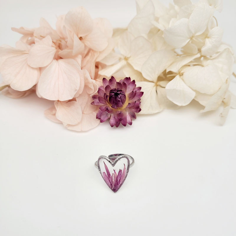 La fleur, séchée et délicatement préservée dans la résine, révèle toute sa finesse dans un cabochon en forme de cœur.
