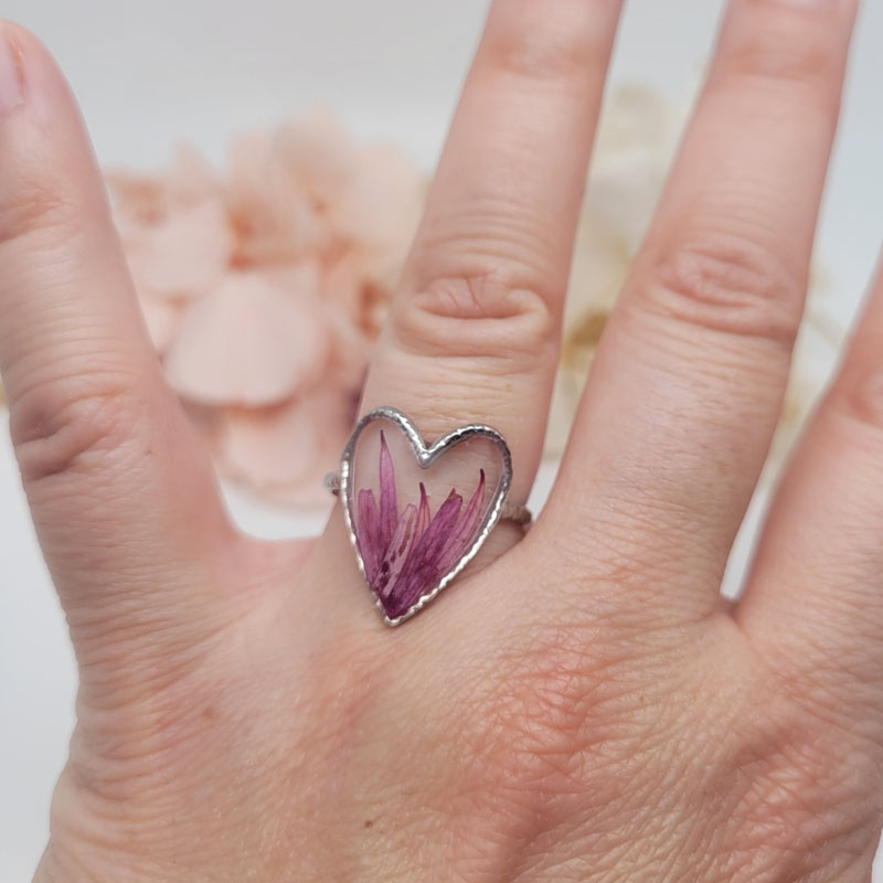 Son cabochon en forme de cœur abrite une véritable fleur de centaurée rose, minutieusement cueillie, séchée et encapsulée dans une fine couche de résine transparente.