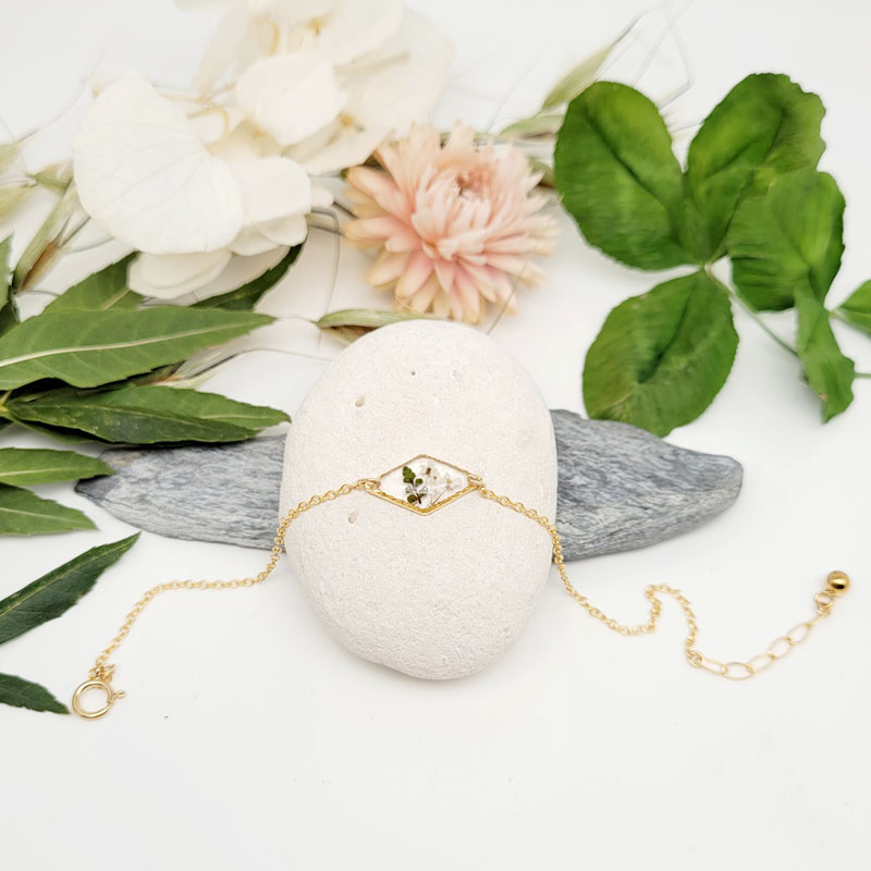 Bracelet fin, avec chaine plaqué or. Ce dernier laisse apparaître sur votre poignet un petit médaillon losange rempli de feuilles de capillaire des murailles et fleurs de carottes sauvages blanches. Ce bijou tendance poétique, avec un brin de nature en lui peut se porter en toute occasion.