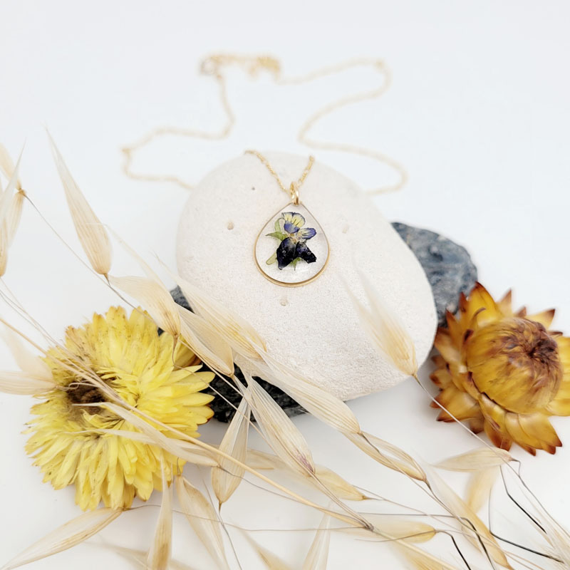 Ce collier délicat doré à l'or fin jaune met en valeur un pendentif en forme de goutte renfermant une véritable fleur de pensée sauvage, cueillie à la main dans la nature ardéchoise. La transparence de la résine laisse apparaître toute la finesse de ses pétales, créant un bijou lumineux, raffiné et féminin.