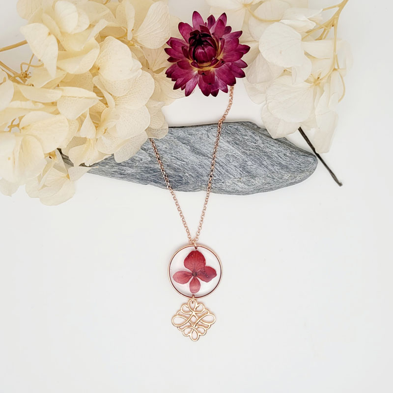 Sautoir mêlant chaîne en laiton plaqué or rose et un succession de 2 pendentifs. Le premier pendentif contient en son centre une fleur d'hortensia teintée rouge, encapsulée dans la résine. Le second pendentif est une forme filigrané carré plaqué or rose. Le contraste des couleurs donne un ensemble lumineux et rayonnant. Bijou au top de la féminité, ultra chic et tendance.